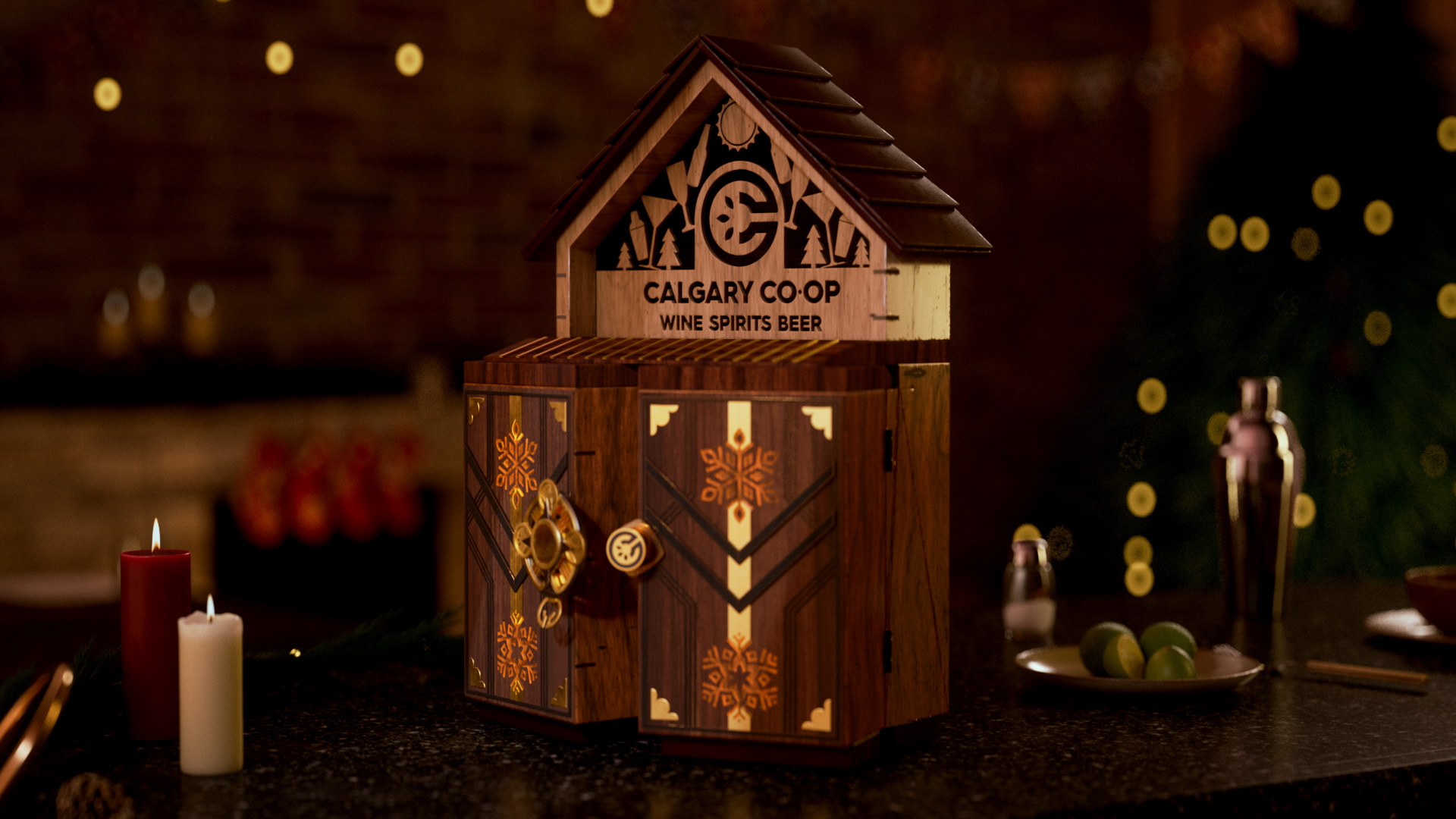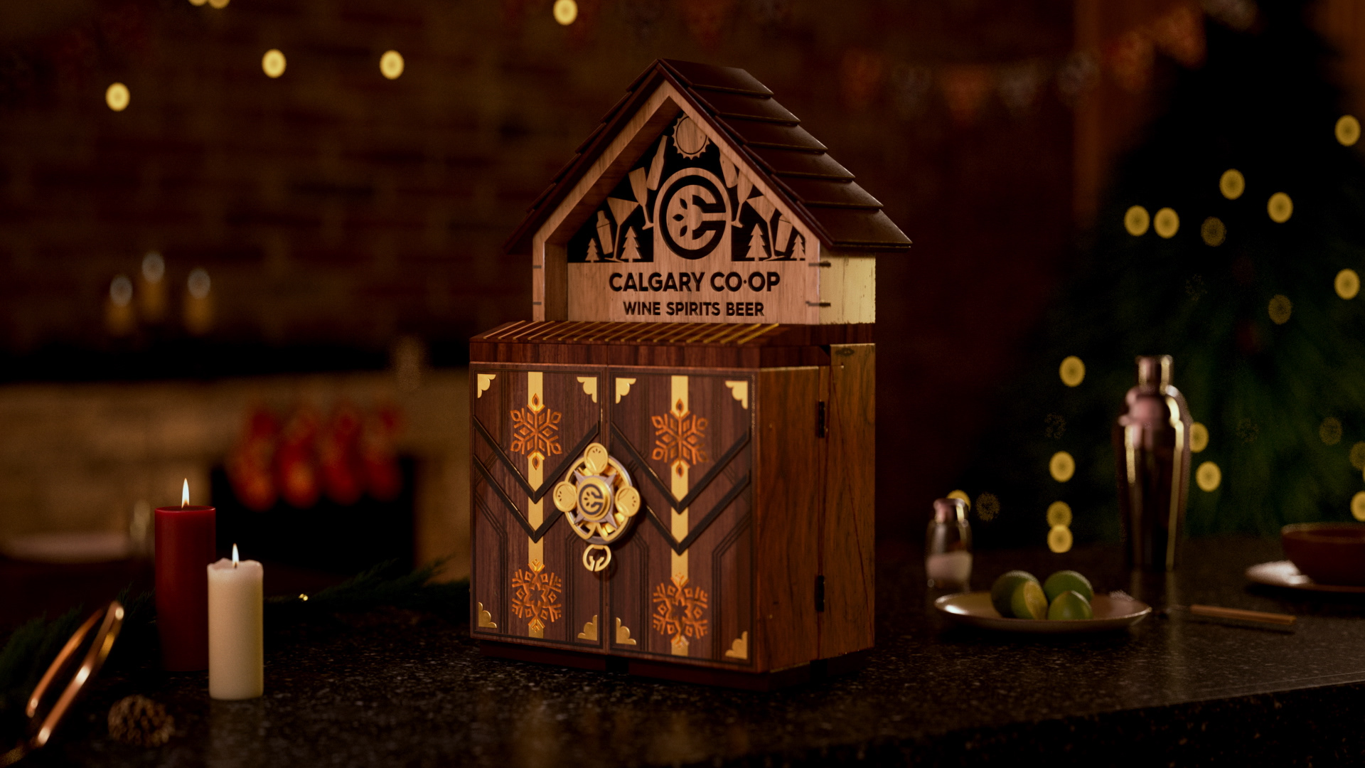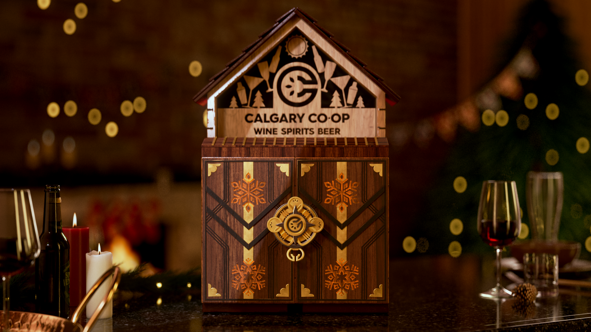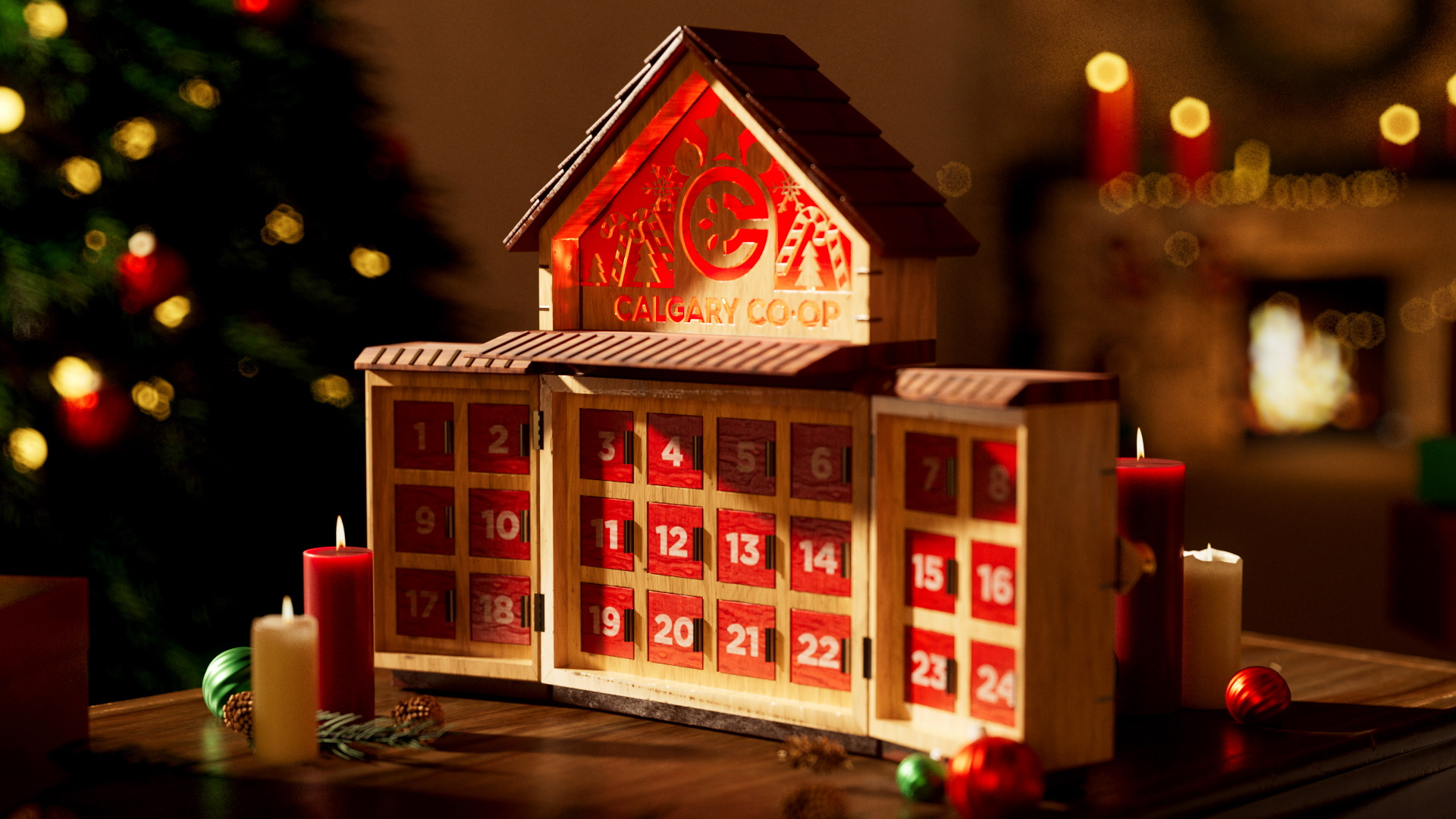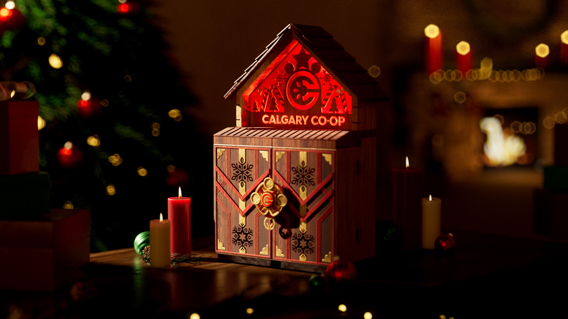 We designed an artisanal advent calendar concept to highlight daily in-store discounts. We developed two versions: a red food calendar and a black liquor calendar. The calendar integrates the Co-op logo into a layered build of stained wood and metal accents, set in a cozy scene with subtle New Year’s details, fireplace glow, and restrained lighting.