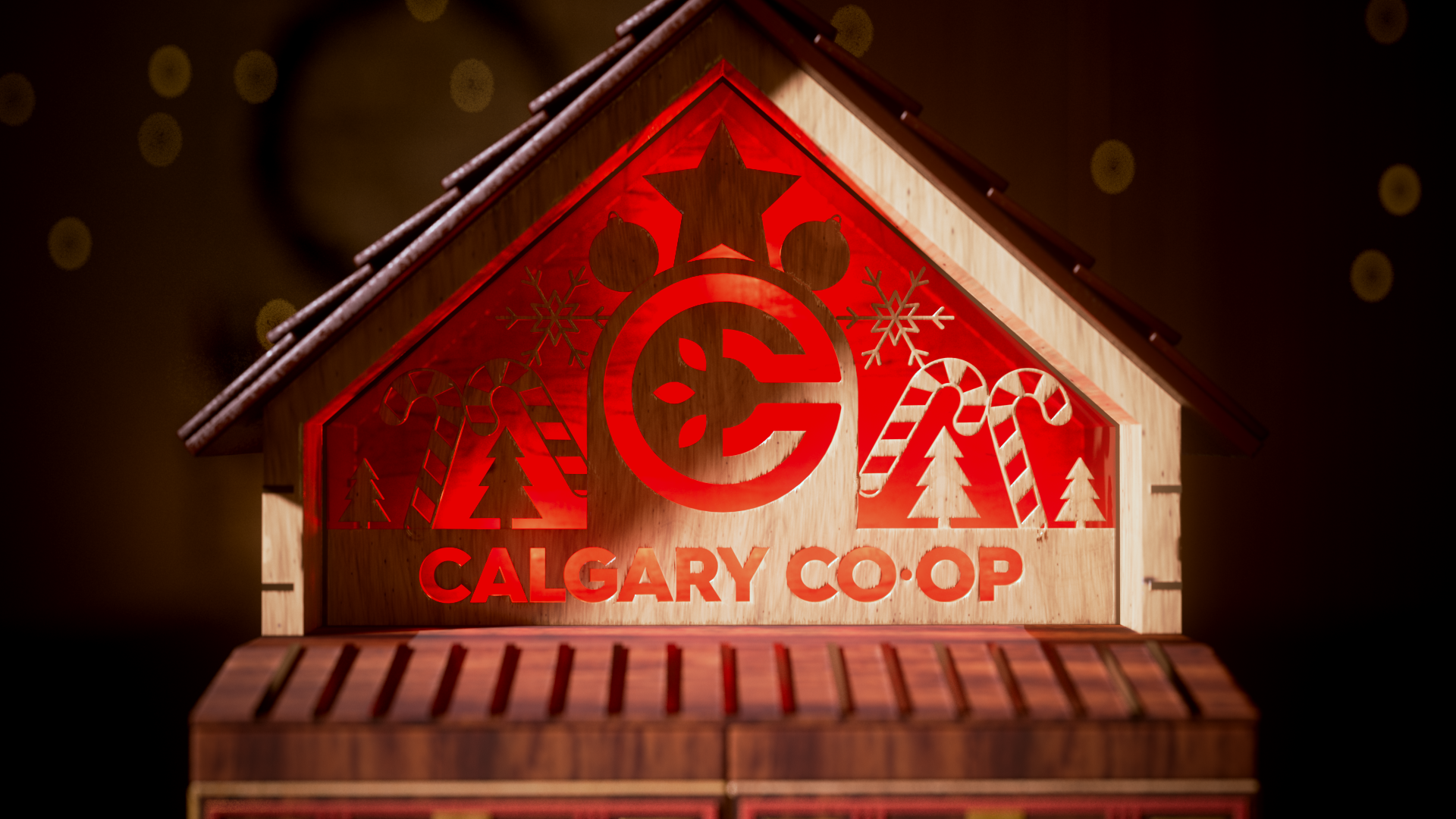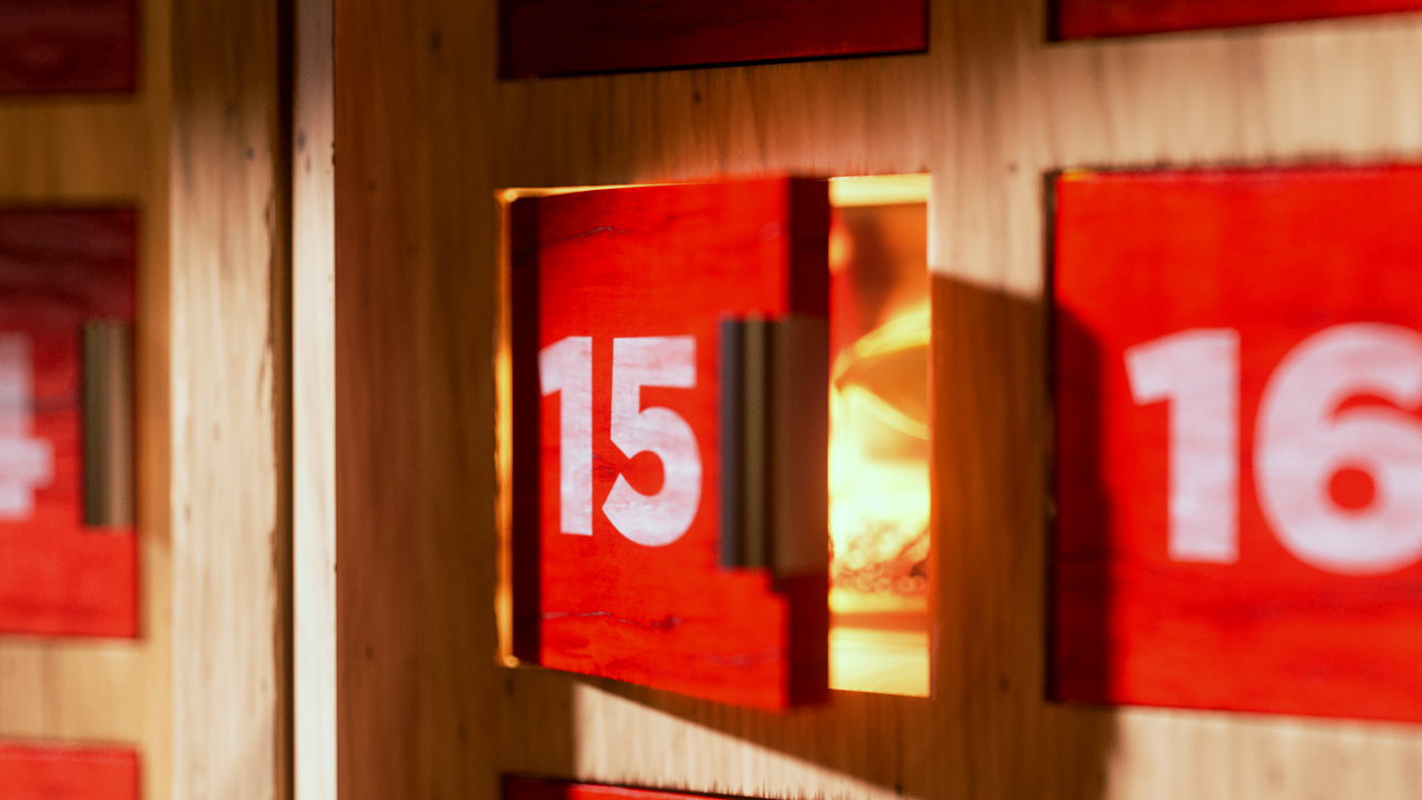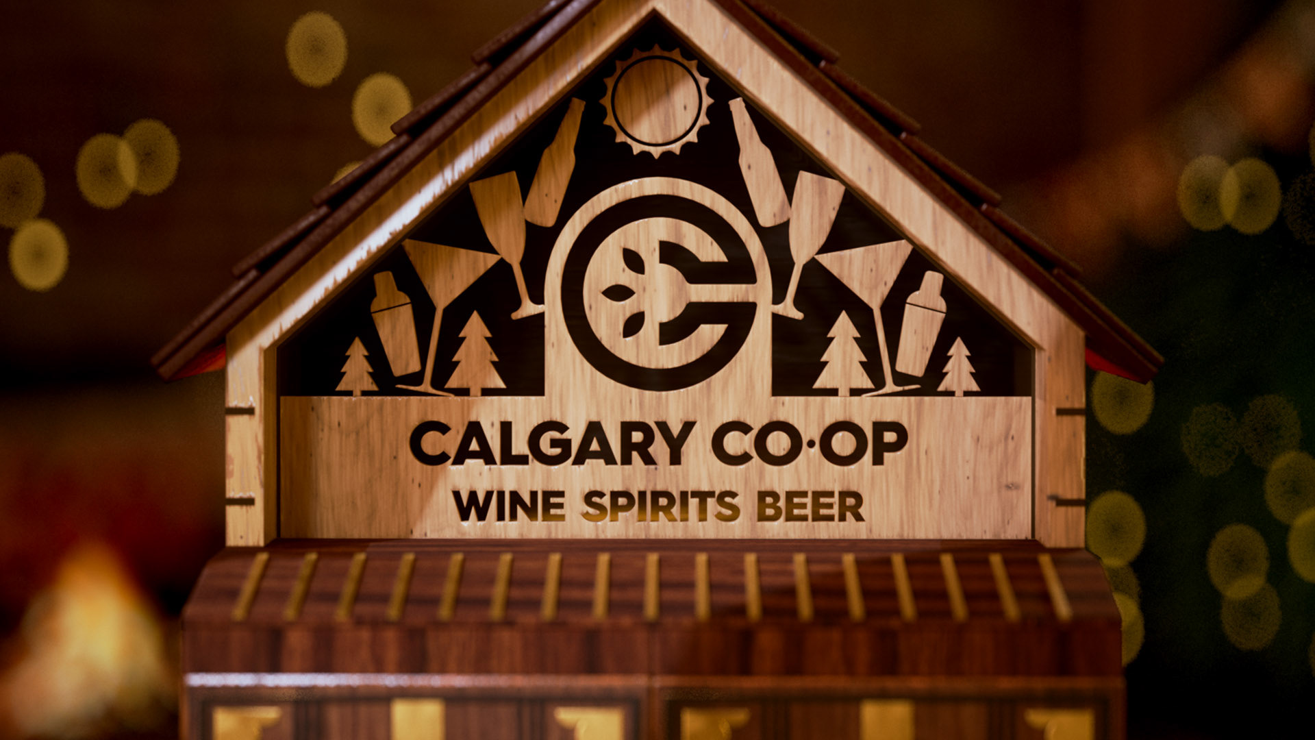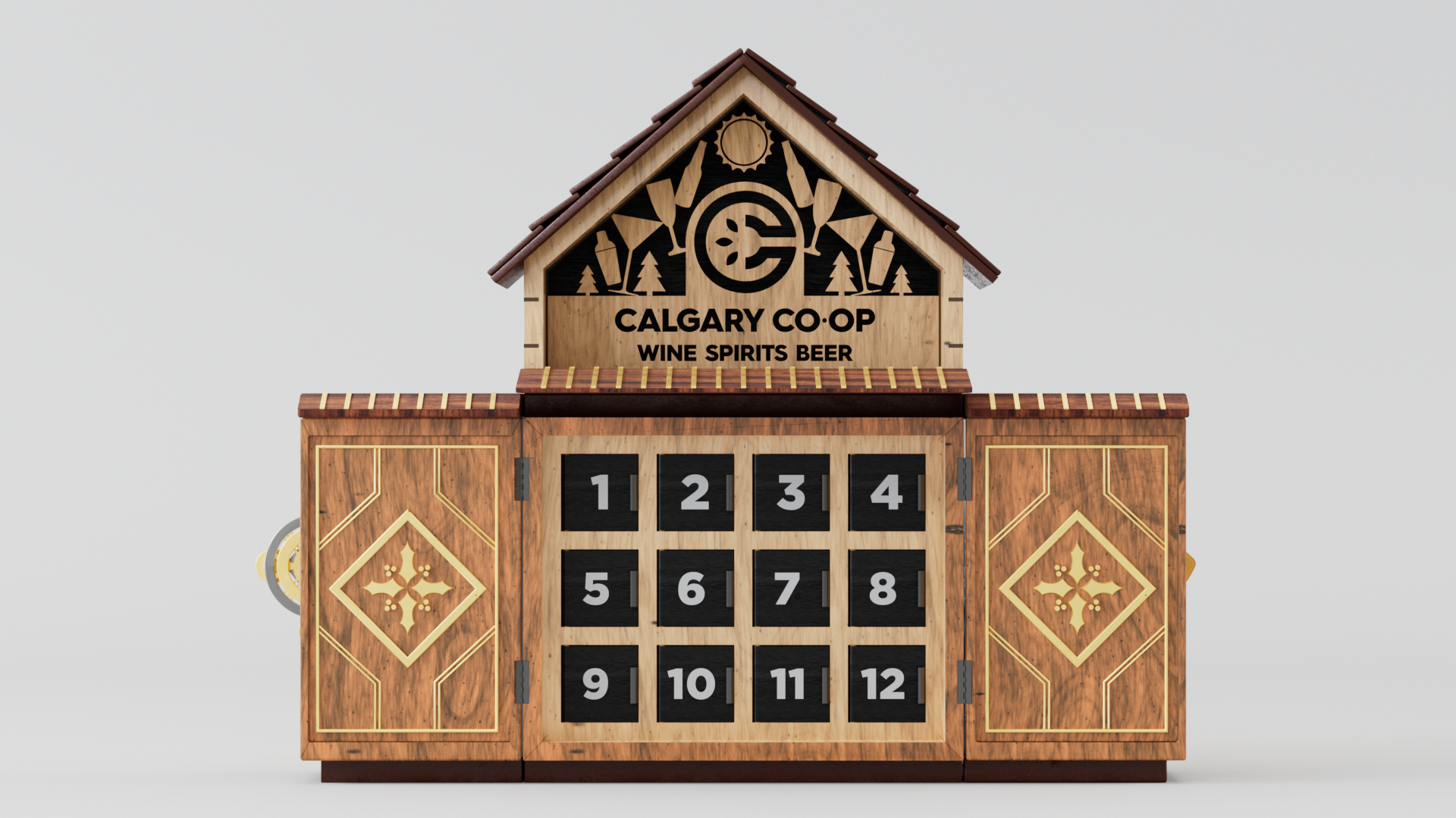 We designed an artisanal advent calendar concept to highlight daily in-store discounts. We developed two versions: a red food calendar and a black liquor calendar. The calendar integrates the Co-op logo into a layered build of stained wood and metal accents, set in a cozy scene with subtle New Year’s details, fireplace glow, and restrained lighting.