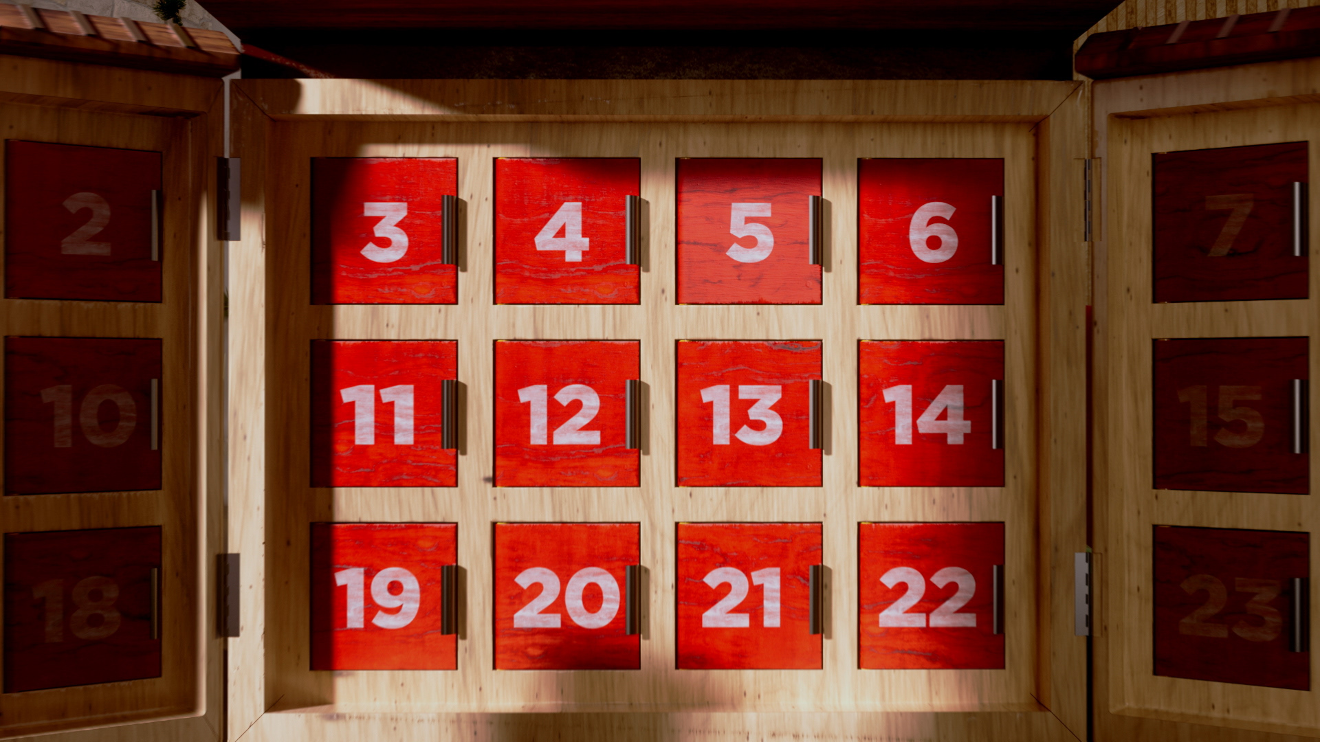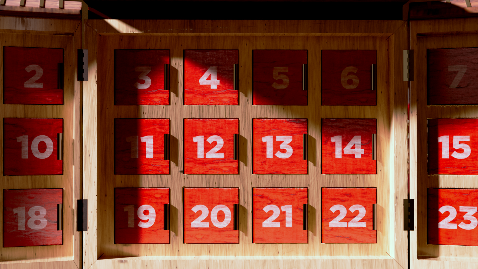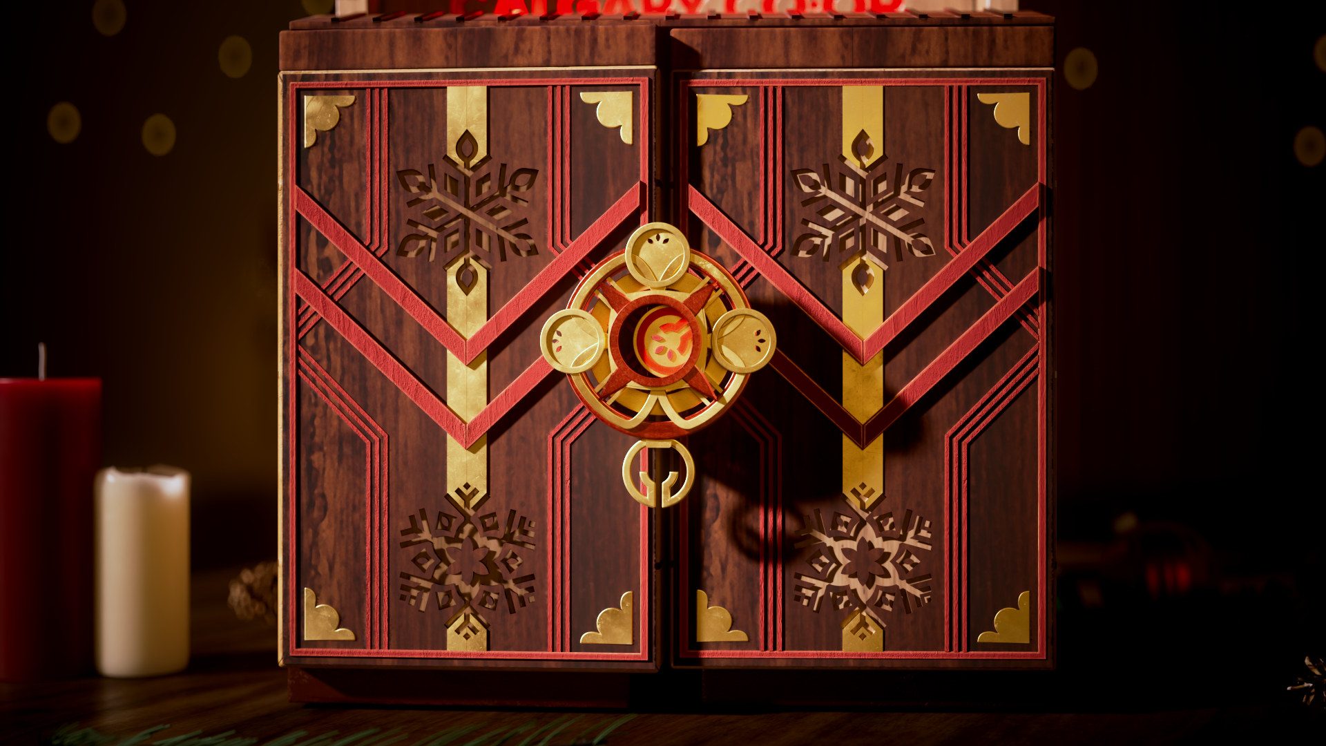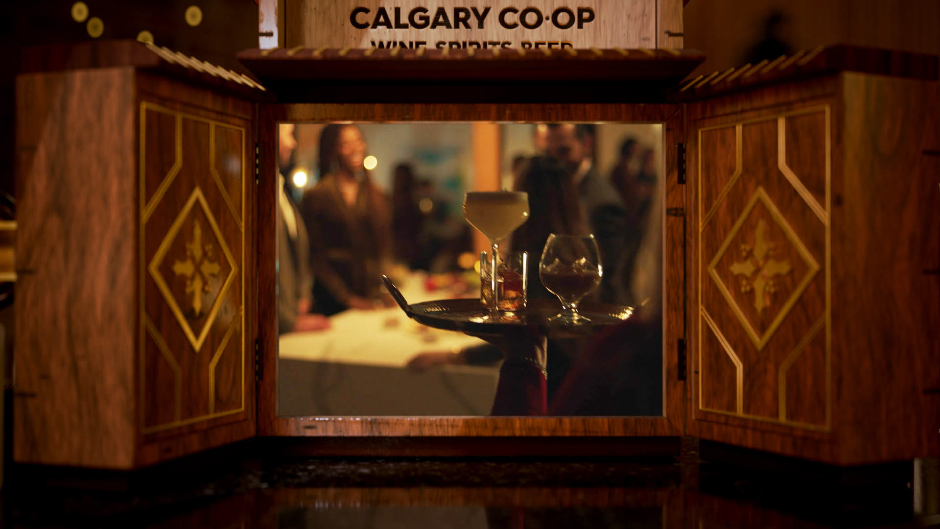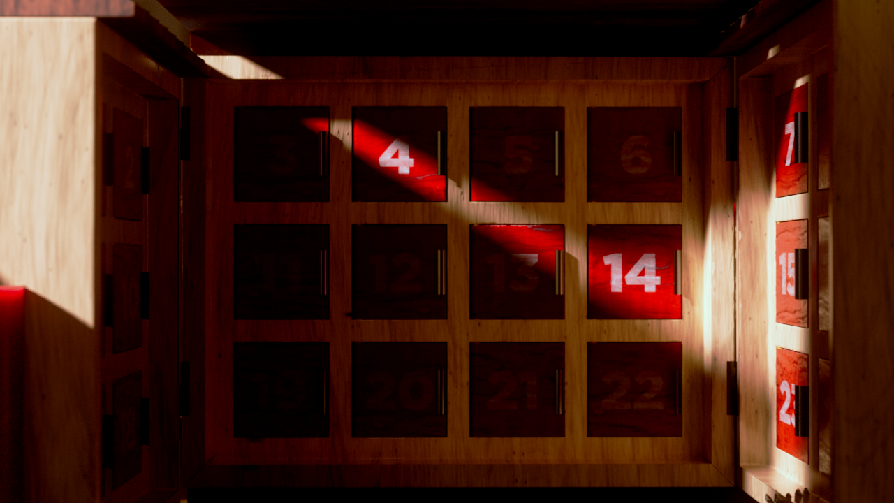 We designed an artisanal advent calendar concept to highlight daily in-store discounts. We developed two versions: a red food calendar and a black liquor calendar. The calendar integrates the Co-op logo into a layered build of stained wood and metal accents, set in a cozy scene with subtle New Year’s details, fireplace glow, and restrained lighting.